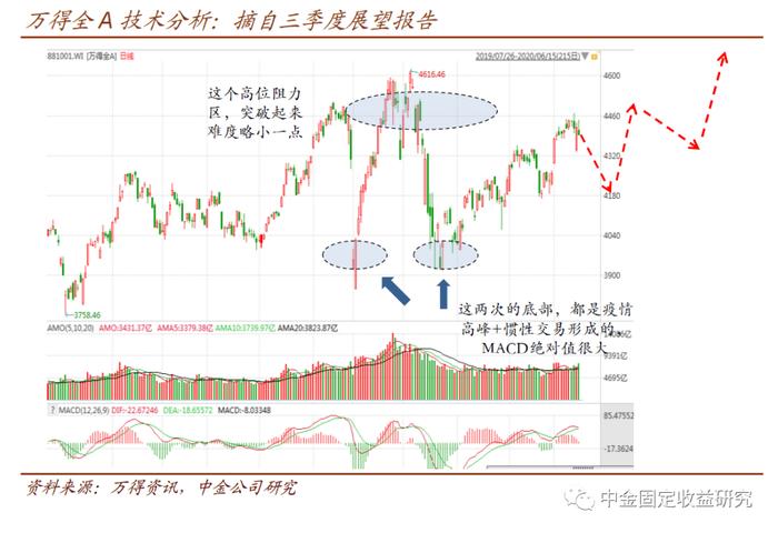 4、趋势分析与基本面分析并不互斥,尤其引入中枢和力度的情况下,二者之间更便于互通。例如下图摘自我们在的转债三季度展望,我们当时判断,虽然市场处于震荡状态,但区间下沿由海内外风险共振形成,MACD绝对值在历史上亦处于少见水平,再结合资本市场改革的情况,这个震荡区间的下沿,突破起来难度明显大于上沿——这也是我们在当时给予积极判断的重要依据。