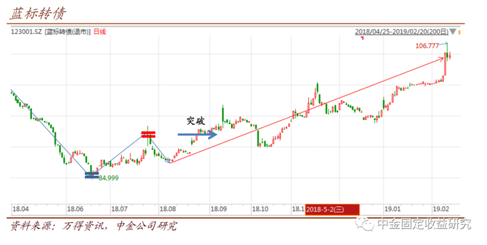 实践中,这些准则对于转债本身的走势,也一样适用。下图为蓝标转债在2018年4月至2019年3月的走势划分。