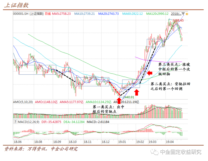 重要的第一类买点与背驰。可见,如果说第三类买点与利弗莫尔体系下的买点并无本质区别、第二类买点又相对不重要(有时与三买重合,有时不清晰)的话,那么第一类买点就是其鲜明的特点和优点:因为它赋予了投资者在左侧发起进攻的根据——对转债投资者来说,又有特殊的意义,因为当转债估值较低时,转债投资者比股票投资者更有条件去在左侧试错,反之趋势形成后,转债相比股票反而没有优势。于是,作为第一类买点的重要依据——背驰的判断就显得更为重要。不过,相比其他概念的完备性,背驰(至少在事前)需要一些主观判断的成分。市场上应用最多的还是MACD指标,典型的判断如:次级别走势挣脱中枢时,形成的MACD红色面积不能创新高,或相比前次进入中枢时有较大差距,则判定背驰。
