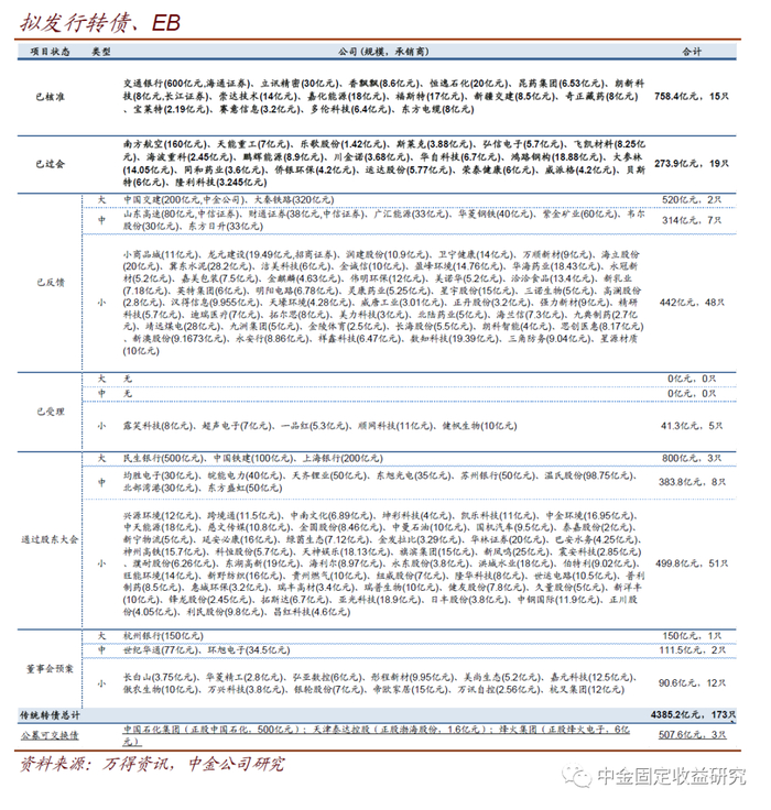 本周新公告了3个转债预案,为杭州银行(150亿元)、万讯自控(2.56亿元)、杭叉集团(12亿元);健帆生物(10亿元)发行可转债申请获深交所受理并发布募集说明书申报稿;5个方案过会,为荣泰健康(6亿元)、威派格(4.2亿元)、贝斯特(6亿元)、南方航空(160亿元)、隆利科技(3.245亿元);宝莱特(2.19亿元)、赛意信息(3.2亿元)、多伦科技(6.4亿元)、东方电缆(8亿元)拿到核准批文。目前核准待发个券共15只758.4亿元,已过会未核准个券共19只273.9亿元。