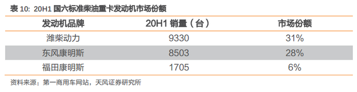 康明斯国六发动机表现出色,更新换代支撑其提高市场份额。今年上半年康明斯合资公司的国六柴油重卡发动机销售表现抢眼,东风康明斯和福田康明斯20H1累计销量分别为8503台和1705台,市占率分别达到28.3%和5.7%。随着国六标准的稳步推进,结合重卡市场持续景气的未来预期,我们认为国六柴油重卡发动机将持续作为增量市场为康明斯扩大市场空间打下基础。