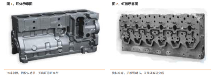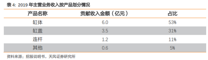 专注于生产柴油发动机三种核心零部件。公司主营业务为柴油发动机零部件,销售产品包括缸体、缸盖、连杆、飞轮壳、主轴承盖、排气管、齿轮室;受托加工产品为缸体、缸盖和连杆。三大核心零部件,即缸体、缸盖和连杆为公司主要产品,贡献95%的营业收入。此三大产品均为发动机核心零部件,是发动机整体质量的关键决定因素:缸体为发动机最大的单独式部件,与缸盖、活塞共同构成燃烧室,支撑和保证活塞、连杆、曲轴等运动部件工作时的准确位置;缸盖安装于缸体的上方,从上部密封气缸并构成燃烧室;连杆将活塞承受的力传给曲轴,使活塞的往复运动转变为曲轴的旋转运动。