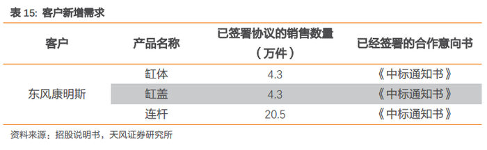 产能瓶颈突破,满足客户需求。随着各新建项目逐步落地并投产,公司产能将进一步提高,并有效消除产能瓶颈,为现有订单的落地和新项目的开拓打下坚实基础,进一步满足客户产销量提升所带来的供应需求。于此同时,公司与广西玉柴和东风康明斯均签署了增产合作意向书,新增产能有明确配套计划,有效降低产能过剩风险。