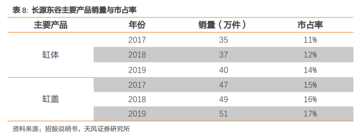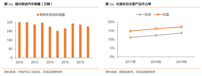 公司专注于核心零部件研发生产,且与国内知名生产厂商长期稳定合作,由此积累了较高的知名度和认可度。在柴油车销量整体下滑的背景下,缸体缸盖销量依然逆势增长,市占率随之持续提升。