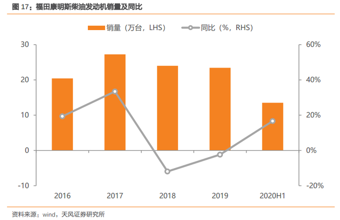 康明斯份额提升直接利好长源东谷。公司对主要客户康明斯的销售收入占比约为85%:2019年对福田康明斯销售收入为7.4亿元,占总收入的64%;对东风康明斯销售收入2.3亿元,占比为20%。福田康明斯和东风康明斯也将公司作为其核心或唯一供货商,销量表现出色将使公司直接受益。上半年康明斯表现抢眼,其中福田康明斯20H1发动机累计销售13.5万台,同比增长高达42%,拉动公司营业总收入同比增长32.6%。