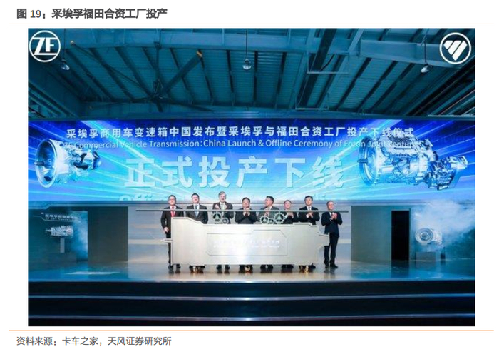 福田联手采埃孚,大力布局AMT重卡市场。福田洞察到国内商用车市场中高端化和自动化的潮流趋势,2017年就推出EST-A系列AMT重卡,使其子品牌欧曼成为我国自动挡重卡行业的先驱者之一。同时,福田联手变速箱行业巨头采埃孚组建了两家合资公司,建设采埃孚变速箱全球最大生产基地,并于19年4月起量产最新一代AMT变速箱,加大产业布局力度。经过多年的努力,欧曼已经发展出EST-A、EST、GTL等系列自动挡产品,涵盖多个重卡品类。