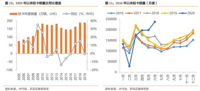 轻卡销量连续十一年超过145万辆,20Q2增幅较大。2009年,全国轻卡销量同比增长35%至145万辆,此后十一年销量均维持高位,截至2019年达到188万辆。2020年上半年,全国轻卡销量97万辆,同比增长1%;20Q2销量63万,实现增速36%,其中6月份单月实现销量24万,同比增长82%,单月增速创十年新高。