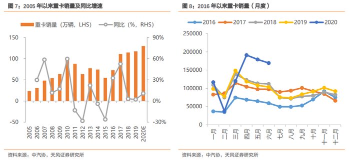 16年下半年以来,重卡行业迎来新一轮高景气,20年上半年销量超预期。16-17年重卡销量迅速回暖,17-19年连续三年实现110万辆以上的重卡销售。2020年4-6月重卡销量分别为19万、18万、17万,销量连续三个月创历史当月新高;整个上半年,随着疫情影响的降低,叠加物流工程需求及国三重卡替换,全国重卡销量达到81万辆,同比增长24%,增速为18年以来新高,我们预计全年销量将达到140万辆。