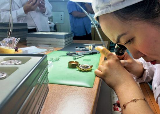 ▲工人在安装机芯零件,摄影:安舜