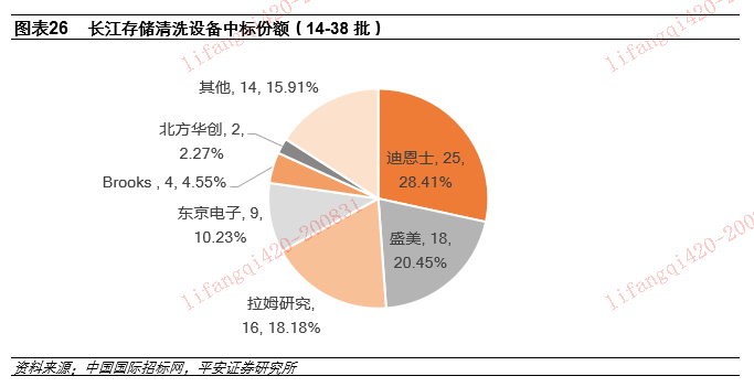 (3)在长江存储近几年的半导体清洗设备招标中,盛美股份获得20%的清洗设备份额,北方华创份额为2%,均高于其全球平均水平。国产清洗设备厂有望把握国产芯片产线扩产大潮,提高市占率。