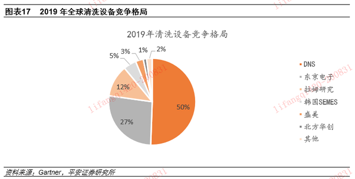 (4)全球竞争格局方面,迪恩士是全球龙头,市占率达50%,其次是东京电子和拉姆研究,CR3接近90%。国内公司中,盛美股份、北方华创2019年全球份额分别为3%、1%。