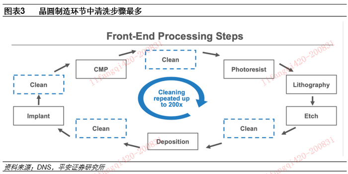 三大环节中,晶圆制造环节的清洗步骤最多,清洗设备运用也最多,几乎每一步光刻、刻蚀、沉积、离子注入、CMP(化学机械抛光)均需要经历清洗工艺。