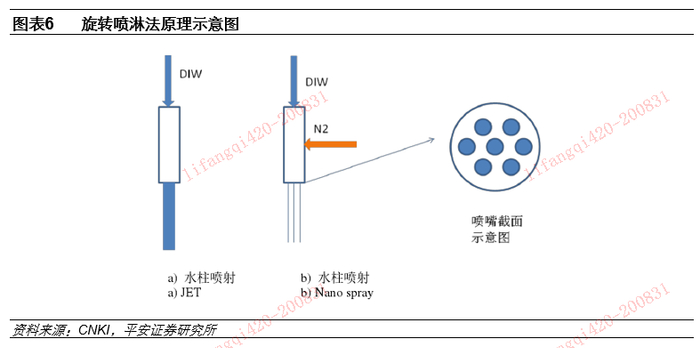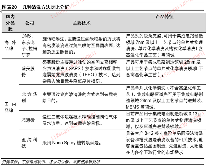 (1)国际清洗设备巨头多采用旋转喷淋技术,国内清洗设备厂商采用差异化路线进行追赶,如盛美股份、北方华创研发兆声波清洗技术,芯源微研发二流体清洗技术,并取得了不错的成效。