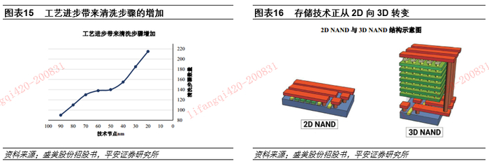2)当工艺尺寸达到14nm之后,存储技术将会达到尺寸缩小的极限,存储芯片逐步从二维(2D)结构向三维(3D)结构推进。例如在3D NAND(计算机闪存设备)制造工艺中,需将原来2D NAND中二维平面横向排列的串联存储单元改为垂直排列,通过增加立体层数,解决平面上难以微缩的工艺问题,堆叠层数也从32层、64层向128层发展。存储技术从2D向3D转变,清洗晶圆表面的基础上,还需在无损情况下清洗内部污染物,对清洗设备提出了更高的技术要求,清洗设备单台价值量不断提升。
