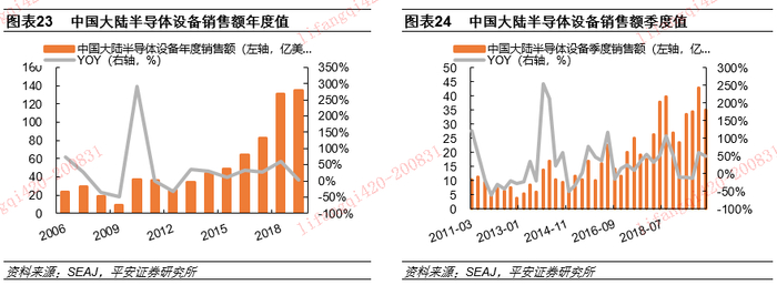中国大陆半导体设备连续多年景气向上。2013-2019年中国大陆半导体设备市场持续6年景气向上。2019年尽管全球半导体设备销售额下滑,但大陆半导体设备依然实现正增长,同比增长3%至134.5亿美元,占全球比重达23%。2020年一季度,大陆半导体设备销售额达35.0亿美元,同比增长48%,维持高景气趋势。