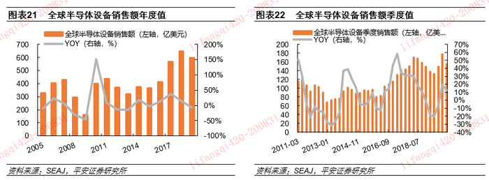 全球半导体设备市场空间庞大。根据日本半导体制造装置协会(SEAJ)统计,2016-2018年,全球半导体设备销售额分别为412.4亿美元、566.2亿美元、645.3亿美元,同比增长13%、37%、14%,呈现三年景气向上周期。2019年受贸易战等多方面因素影响,全球半导体设备销售额下滑7%至597.5亿美元。2020年一季度,全球半导体设备销售额达155.70亿美元,同比增长13%。