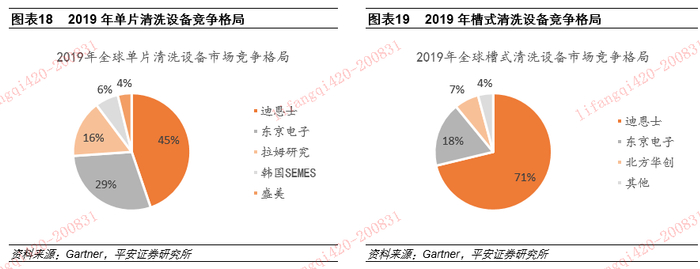 两大类核心清洗设备中:1)单片清洗设备的全球供应商分别为迪恩士、东京电子、拉姆研究、韩国SEMES、盛美股份。2019年迪恩士、东京电子、拉姆研究份额分别为45%、29%、16%,CR3达到90%。2)槽式清洗设备中,2019年迪恩士、东京电子、北方华创份额分别为71%、18%、7%,迪恩士一家独大。