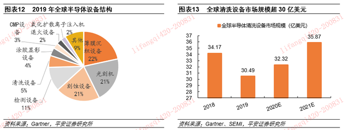 (3)全球清洗设备市场规模超30亿美元,大陆市场约7亿美元。随着芯片先进制程的进步及芯片结构的复杂化,清洗设备市场有望量价齐升。