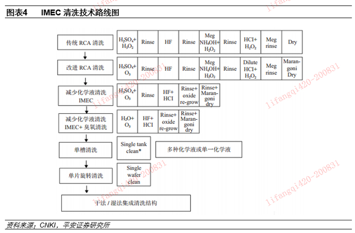 ④IMEC清洗:IMEC(Interuniversity Microelectronics Center)在清洗工艺技术中做了大量的研究工作,其中最重要的贡献是应用了稀释的RCA清洗技术,并且IMEC已经描绘出未来的清洗技术发展方向:清洗技术是朝着减少化学液及清洗流程的方向发展。