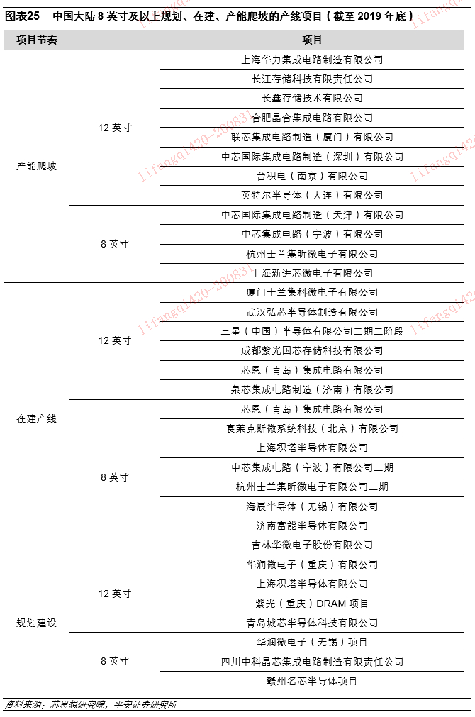 半导体设备国产替代机会来自于国内晶圆厂的扩产。根据芯思想研究院统计数据,截至2019年底,中国大陆共有14条8英寸及以上的产线在建,同时12条线产能正在爬坡,此外7条线规划中。
