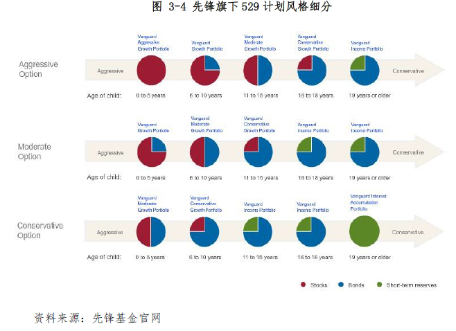 先锋对529计划同样也是采用类似生命周期基金的投资方式,当子女年龄较小、离入学时间较长的时候,计划将大部分的资产投资于股票,随着子女年龄的增长、入学时间的接近和父母收入风险的变化逐渐降低股票型资产的配置,增加债券和货币市场的资产比重。
