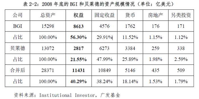 2008年底,BGI管理资产规模为1.53万亿美元,贝莱德则为1.31万亿美元,二者合并后管理资产规模高达2.8万亿美元。