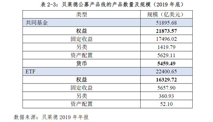 截至2019年底,贝莱德管理资产规模共7.43万亿美元,其中,主动型基金管理规模1.95万亿美元,指数型基金(不含ETF)管理规模2.69万亿美元,ETF管理规模2.24万亿美元,货币基金管理规模0.55万亿美元。贝莱德的产品线具有种类齐全、数量繁多的特点,尤其是在ETF产品方面。