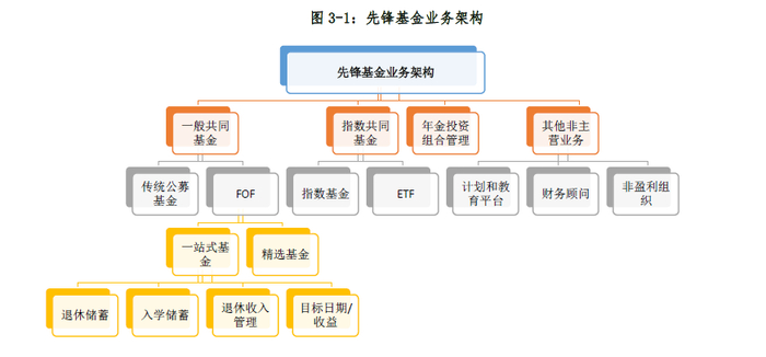 先锋目前业务主要分为一般共同基金(传统公募及FOF)、指数共同基金(指数基金和ETF)、年金管理和其他非主营业务等四大领域;根据服务对象,又分为个人投资者服务、机构投资者服务、金融咨询服务和海外投资者服务,并以服务客户为宗旨建设了复杂的细分产品线,对应产品供给已超过180只。