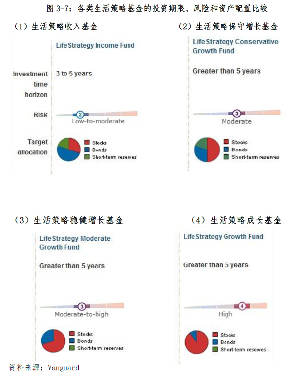 先锋旗下的生活策略基金(Vanguard LifeStrategy Fudns)是根据投资者风险偏好,对旗下4只基金进行不同比例配置构建成FOF,从而实现投资者特定的中期或长期目标。该系列包括4只子基金,分别为生活策略收入基金(LifeStrategy Income Fund)、生活策略保守增长基金(LifeStrategyConservative Growth Fund)、生活策略稳健增长基金(LifeStrategyModerate Growth Fund)以及生活策略成长基金(LifeStrategy Growth Fund),风险和收益依次递增。