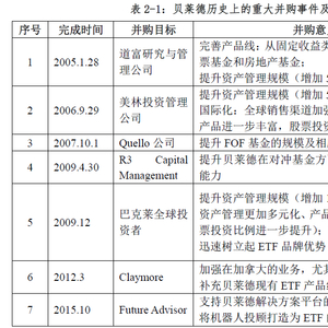 在多元化发展阶段,贝莱德开展了一系列的并购活动,以通过并购进行业务转型,增强其核心竞争力。2005年,收购道富研究与管理公司;2006年,开展与美林投资公司的合并;2009年,收购巴克莱全球投资公司(Barclays Global Investors,以下简称BGI)。