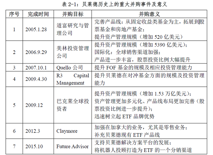 贝莱德是并购方面的“行家里手”,其通过一次次的成功并购行为,实现了扩大公司资产管理规模、完善公司产品线、拓展公司业务等战略目标。我们在下表列出了贝莱德成立以后重大并购事件,以及并购完成后对贝莱德的业务和发展带来的意义。此外,在下文中,我们将详细介绍贝莱德的几次重点并购行为。