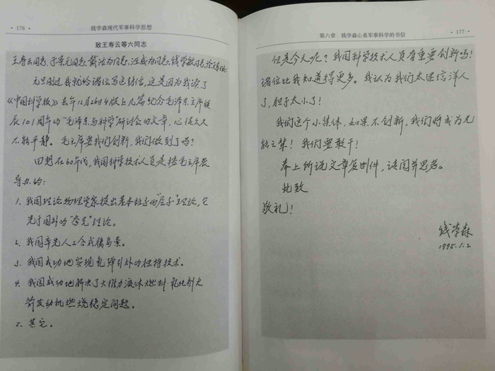 为了澄清到底什么是“钱学森之问”,我们回顾收录在《钱学森现代军事科学思想》(北京:科学出版社2011年出版)一书中的一封钱学森亲笔信(第176-177页)。下面是这本书、钱学森亲笔信的照片以及信的全文。