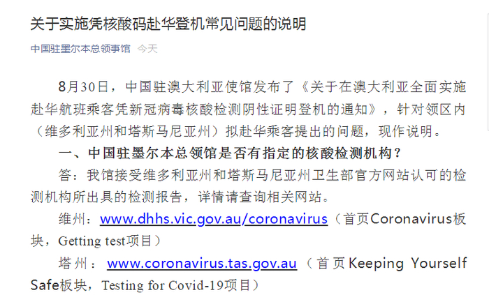 北京时间8月31日上午,中国驻墨尔本总领事馆发布关于实施凭核酸码赴华登机常见问题的说明。8月30日,中国驻澳大利亚使馆发布了《关于在澳大利亚全面实施赴华航班乘客凭新冠病毒核酸检测阴性证明登机的通知》,针对领区内(维多利亚州和塔斯马尼亚州)拟赴华乘客提出的问题,现作说明。