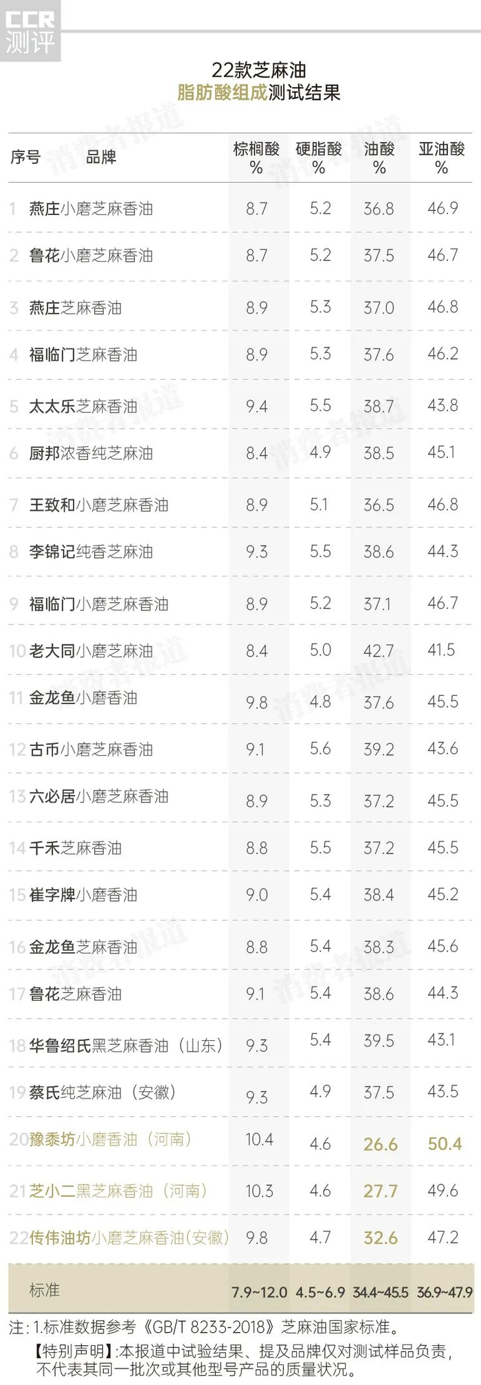测试结果显示,豫黍坊小磨香油(河南)、芝小二黑芝麻香油(河南)、传伟油坊小磨芝麻香油(安徽)等3款小作坊芝麻油的油酸含量均不符合《GB/T 8233-2018》国标要求。