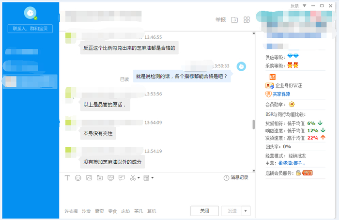 供应商的客服跟品管确认后表示,精炼芝麻油的勾兑比例可以是10%~50%,甚至达到60%,反正哪种比例勾兑出来的芝麻油都是合格的。