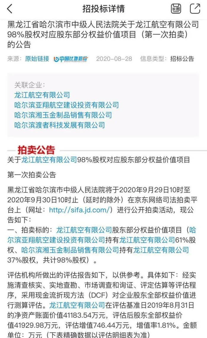 近日,黑龙江省哈尔滨市中级人民法院发布关于龙江航空有限公司98%股权对应股东部分权益价值项目(第一次拍卖)的公告,意味着这家民营航空公司被清算、易主,能否再次起飞还是个未知数。