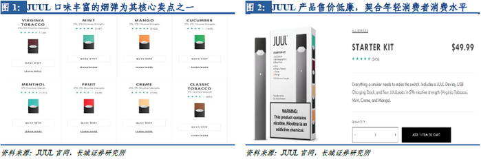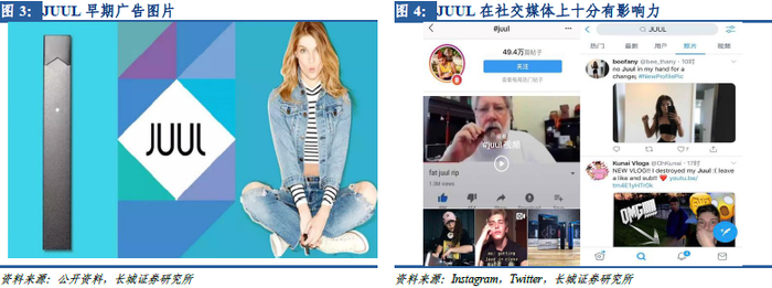 以美国电子烟独角兽JUUL为例,JUUL以丰富的烟弹口味广受年轻电子烟消费者欢迎,其芒果、奶油布丁、黄瓜等口味口感更为柔和,因此更容易被年轻消费者接受。同时,JUUL的产品定价更契合年轻消费者的消费能力。JUUL的烟具加4枚烟弹套装售价仅为49.99美元(约345元人民币),4枚烟弹的售价仅为15.99美元(约110元人民币),因此其产品得以被年轻消费者接受。营销策略上,JUUL也主攻青少年市场,在Instagram、Facebook等青少年钟爱的社交媒体上大肆宣传,提高其品牌在青少年消费者中的影响力。在广告中多使用受青少年欢迎的浅色亮色,吸引年轻消费者眼球。2015年,JUUL更是选择在年轻人聚集的音乐会等活动中,向颜值较高的年轻人免费派发JUUL产品,以期吸引更多的青少年消费者的关注。JUUL凭借着在年轻消费者中的巨大成功,2018年其在美国电子烟市场份额已高达30%。