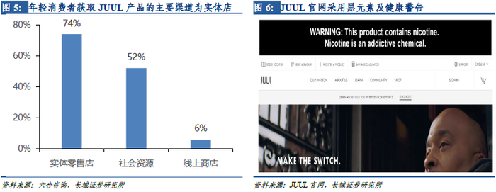 受FDA新规影响,JUUL计划在实体零售店停止销售大部分调味电子烟产品,将其转移至可核实年龄的网站上销售,同时已停止接受9000多家销售JUUL产品的零售店的芒果、水果、奶油、和黄瓜口味的烟油的订单。据六合咨询数据,约有74%的年轻消费者获取JUUL产品的渠道为线下便利店,且JUUL有将近一半的烟弹销售额来自于销售除薄荷、烟草、薄荷醇以外口味的烟弹产品,因此从实体零售店下架调味电子烟对JUUL的业绩将具有较大冲击,但其在非美国市场的调味电子烟销售暂未受影响。同时由于FDA对于电子烟的广告及营销监管从严,JUUL也不得不调整营销策略,采用更多黑色元素,减少在社交媒体的宣传,并在官网上提示电子烟的潜在危害性,预计也会对JUUL的经营产生一定影响。