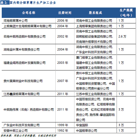 中烟公司控制烟草薄片生产制造产业链的全链条,仅中游生产加工环节允许民营企业参与。烟草薄片的生产与制造在中国受到严格管控,中烟公司是烟草薄片生产加工企业上游唯一供应商,也是下游唯一使用者。各省中烟公司为烟草薄片生产加工企业下达指标并提供烟草薄片原料,由取得国家烟草专卖局相关生产许可证的烟草薄片生产加工企业代为加工,生产线上剩余或废弃原料均需上报,并由中烟公司统一回收剩余原料废料及生产加工后的烟草薄片产品。中游民营企业参与烟草薄片生产加工环节主要分为两大类,第一类为由中烟公司自建烟草薄片生产企业,第二类则为中烟公司与第三方企业合资共建烟草薄片生产企业,由第三方企业提供生产加工技术支持,或获得国家烟草专卖局授权批准参与烟草薄片的生产与加工。A股标的中,【集友股份】与重庆中烟、江苏中烟开展战略合作共同开展新型烟草均值化薄片的研发工作,由重庆中烟及江苏中烟负责提供烟草原料及相关辅料,并配合完成烟草薄片的性能测试及评价,而集友股份负责提供薄片研发场地及平台,并提供相关技术、工艺、人力、及物力支持。港股【华宝国际】子公司广东金叶是国家烟草专卖局烟草薄片研发基地之一,并与广东中烟共建“烟草行业再造烟叶技术研究重点实验室”。