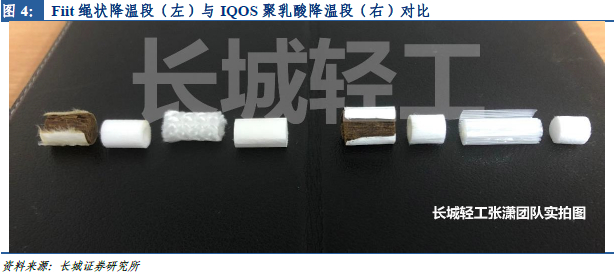 烟弹中的降温段同样为烟弹产品核心之一,各烟草巨头均对其降温技术申请了专利保护,因此不同品牌烟弹产品的降温材料也各不相同。万宝路及HEETS等IQOS适配烟弹品牌均使用环保、安全、且可降解的聚乳酸材质进行降温,母公司菲莫国际并为此项降温段设计申请了专利保护。因此,随后上市的加热不燃烧烟弹品牌均不得不使用其他设计来绕开菲莫国际对此的专利保护。例如,Fiit烟弹便采用了绳状降温段来绕开菲莫国际的专利。英美烟草Glo的适配烟弹Dunhill则直接使用了空管作为降温段,并在烟弹外围留有细孔以便引入冷空气进行降温。四川中烟的宽窄烟弹则采用了铝箔纸作为降温段材料,利用铝箔的导热性能,迅速将热量传递分散。各烟草厂商均对各自烟弹产品的降温段技术申请了专利保护,市面上烟弹降温段设计十分丰富,并构成一定的技术壁垒。