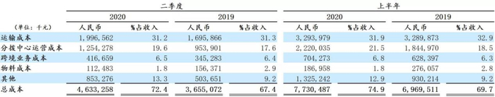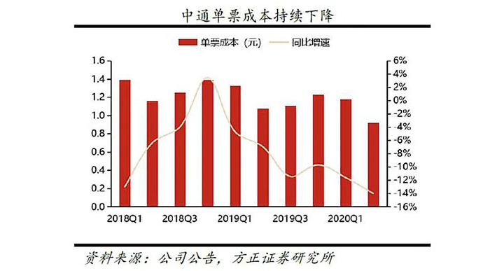 以中通为例,2020年第二季度,扣除跨境业务影响后,中通快递的单票收入为1.29元,同比下降20.9%,单票成本为0.92元,同比下降14.0%。