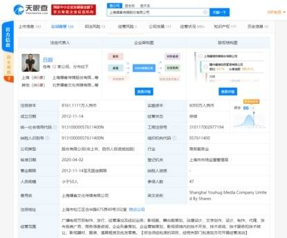 天眼查APP显示,耀客传媒成立于2012年11月,法定代表人为吕超,注册资本约8161万人民币,公司经营范围包括:广播电视节目制作、发行,经营演出及经纪业务;影视剧、舞台剧策划,动漫设计,文学创作等。目前,该公司共有多家对外投资,包括北京耀客文化传媒有限公司、霍尔果斯耀威影视制作有限公司、北京觉醒世代文化传媒有限公司等。