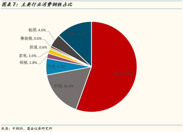 钢铁行业是重要的中游行业,下游衔接机械、房地产、家电、汽车等行业。其中建筑(基建和地产)耗钢量占比达56%,机械和汽车分别占比为17%和6%。