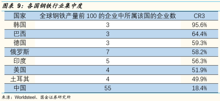 相较于其他产钢大国,中国钢铁企业有高度分散、竞争性强的特征。中国钢铁行业目前有83家上市公司,在2019年全球钢铁产量前100的企业中,中国企业占了55家,这些企业的年产总和为国内钢铁总产量的68.4%。就行业集中度看,韩国、巴西、德国、俄罗斯、印度、美国钢铁行业的CR3均在50%以上,而中国CR3仅为18.4%。