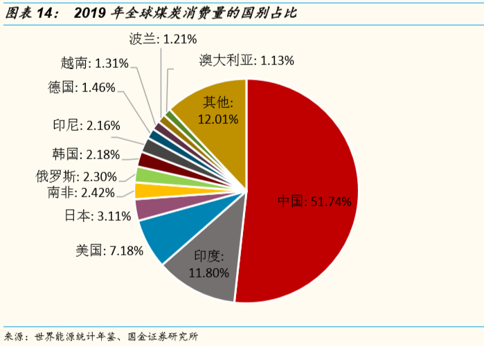 中国是全球第一大煤炭产销国和第一大煤炭进口国。2019年中国煤炭产量为38.46亿吨,占全球煤炭产量的47.63%;印尼次之,占8.98%,美国第三,占8.53%。2019年中国煤炭消费量占全球煤炭总消费量的51.74%;印度次之,占11.80%;美国第三,占7.18%。2009年起中国由煤炭净出口转为净进口,目前已是全球最大的煤炭进口国,主要进口来源是澳大利亚、蒙古和印尼。