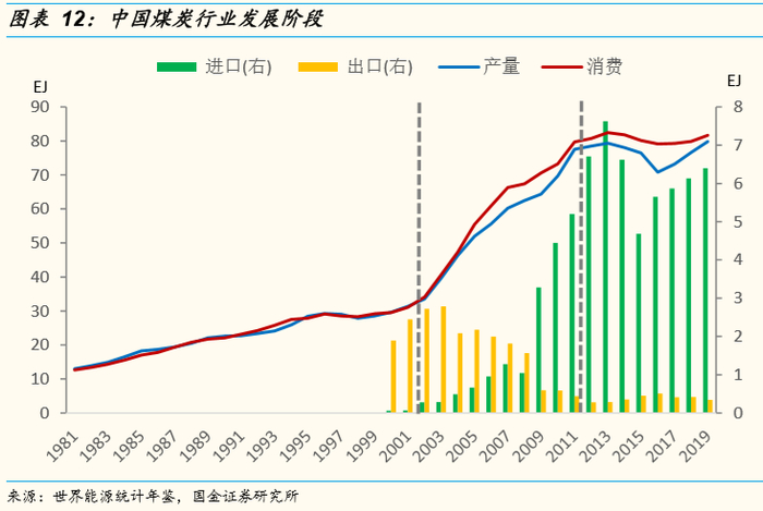 90年代中后期至2011年,煤炭行业经过整顿与治理,迎来健康可持续发展。1997年受亚洲金融危机和国内外市场变化的影响,煤炭市场严重供大于求,全行业陷入困境。中央在 1998年撤销了煤炭工业部,将重点煤矿下放给各地方政府,推进政企分开;对非法开采、不具备基本安全生产条件的小煤矿予以关闭。2001年,全国累计关闭73%小煤矿,原煤产量和行业集中度开始回升,煤炭经济出现转机。2005年,国务院颁布《关于促进煤炭工业健康发展的若干意见》,在此纲领性文件的指导下,我国煤炭工业在供需关系、安全形势、行业集中度、资源利用和环境保护各方面都取得了重大改进。