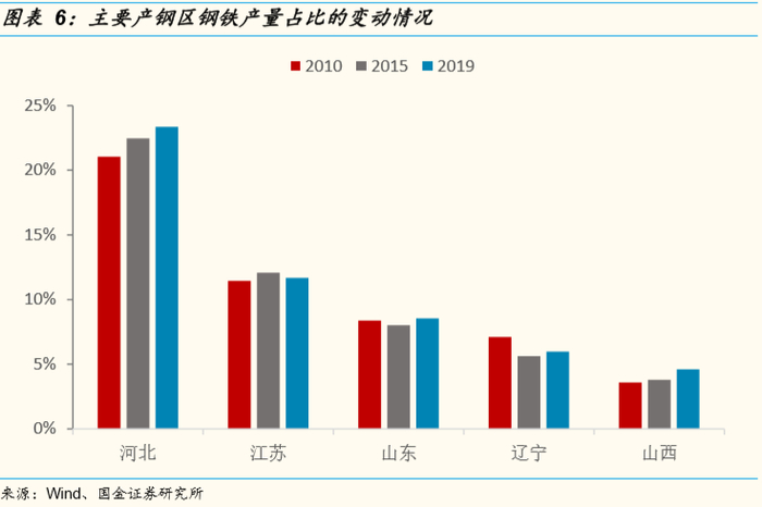 我国主要产钢地区集中在河北、江苏和山东,其中河北是我国钢铁重镇。以2020年上半年为例,我国钢材产量为6.06亿吨,同比增长2.7%,河北、江苏和山东分别占全国产量的24.3%、11.3%、8.8%。就区域布局的聚集程度来看,三个主要产钢省份的钢材产量总占比由2010年的40.9%上升至2019年的43.6%,相对的,辽宁、湖南、上海、北京等产钢区、内陆地区与污染成本较大的地区的钢材产量占比下降了。