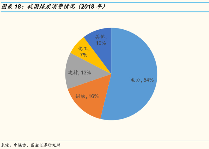 我国煤炭的生产地和消费地天然分离,煤炭生产主要集中在西北地区,而煤炭消费主要以东部沿海地区为主。煤炭消费主要用于发电、钢铁、化工和建材四大行业,2018年电力行业用煤占54%左右,钢铁行业用煤占16%,化工行业用煤占13%左右,其他用煤占10%。其中钢铁行业用煤主要为焦煤,其他行业主要利用动力煤。