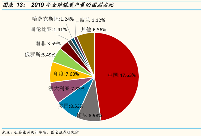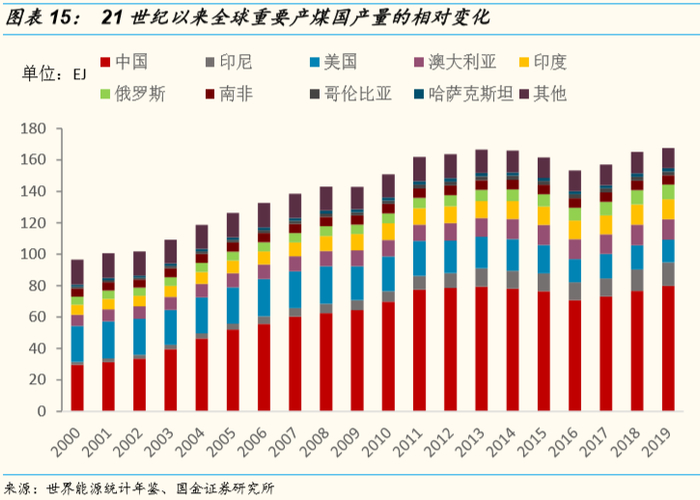 21世纪以来,全球主要产煤国中,中国煤炭产量的别国占比由2000年的30.69%逐年上升至2019年的47.63%;印尼由1.97%上升至8.98%;印度由6.61%上升至7.60%;美国由23.62%下降至8.53%;南非由5.50%下降至3.59%;澳大利亚(7.85%)和俄罗斯(5.49%)基本维持稳定。