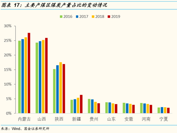 我国主要产煤地区为内蒙古、山西、陕西和新疆,其中内蒙古和山西产煤占比超50%。以2020年上半年为例,我国煤炭产量为18.05亿吨,内蒙古、山西、陕西和新疆分别占全国产量的26.2%、27.0%、17.3%、7.1%。我国煤炭生产重心正加快向资源禀赋好、开采条件好的地区集中。据中国煤炭工业协会统计,2017至2019年来,内蒙古、山西、陕西、新疆、贵州、山东、河南、安徽等 8 个亿吨级(省区)的原煤产量由30.6亿吨上升逐年上升至34.3亿吨,其全国产量占比也由86.8%上升至89.1%。其中,2019年晋陕蒙新四省(区)原煤产量29.6亿吨,占全国的76.9%,同比提高1.7%。